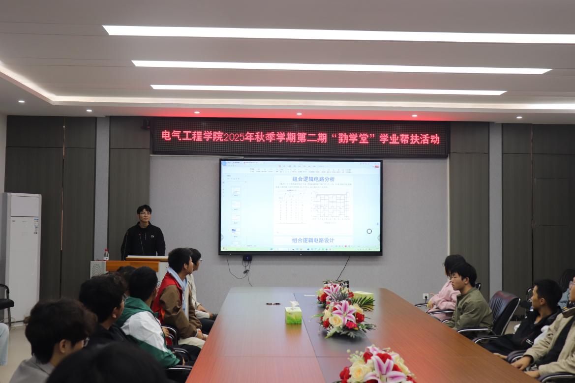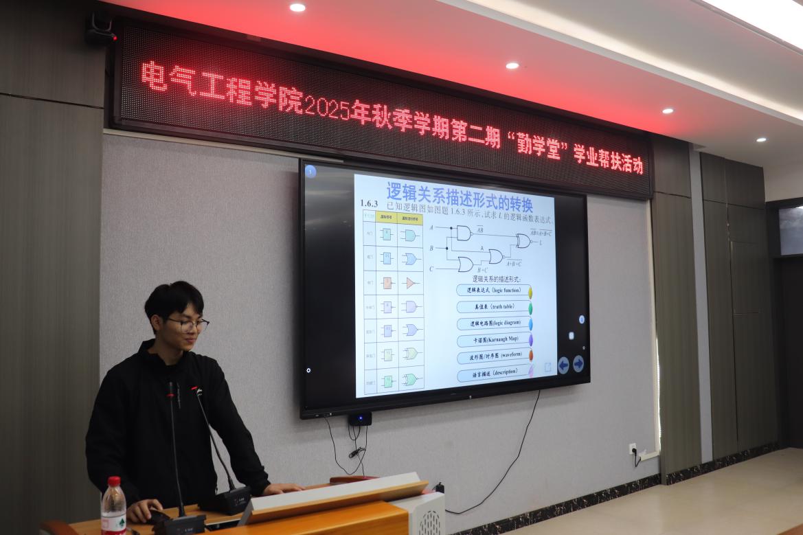 10月30日,南华大学电气工程学院于崇业楼B301会议室成功举办2025年秋季学期第二期“勤学堂”学业帮扶活动。本期活动聚焦“数字电子技术”课程,特邀国家奖学金获得者刘俭厚同学担任主讲,为在场同学带来一场内容翔实、精彩纷呈的学业辅导。