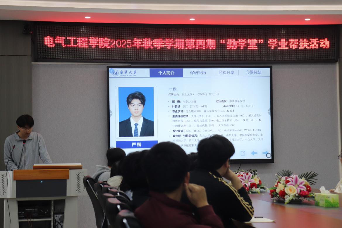 11月6日,南华大学电气工程学院在崇业楼B301会议室成功举办了2025年秋季学期第四期“勤学堂”学业帮扶活动。本次活动特邀国家奖学金获得者严楷同学担任主讲,围绕“保研与竞赛”主题进行分享,吸引了百余名同学踊跃参与,现场反响热烈,学习氛围浓厚。