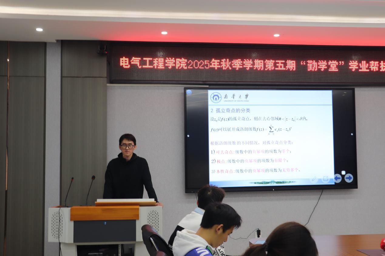 11月11日,南华大学电气工程学院于崇业楼B301室成功举办2025年秋季学期第五期“勤学堂”学业帮扶活动。本期主题聚焦“复变函数与积分变换”的学习方法与解题技巧,特邀国家奖学金获得者宋志远同学担任主讲,为现场同学带来了一场内容扎实、逻辑清晰的专题分享。