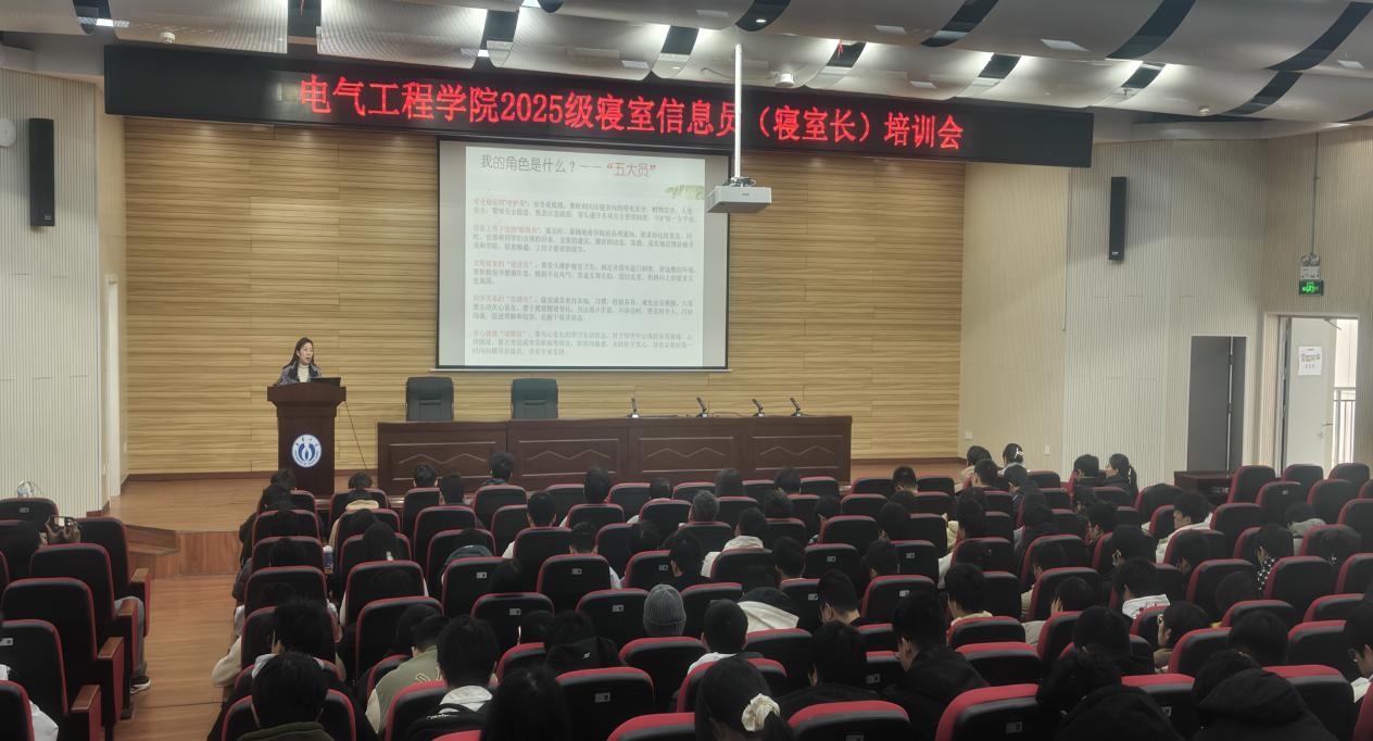 为进一步强化寝室管理工作,明确寝室信息员(寝室长)的职责使命,充分发挥其在学生管理中的桥梁纽带作用,12 月 5 日中午,电气工程学院于崇业楼学术报告厅成功举办2025 级寝室信息员(寝室长)培训会。本次培训由辅导员周珍珍老师主讲,全体2025级寝室信息员(寝室长)参会。