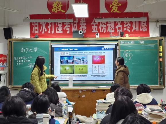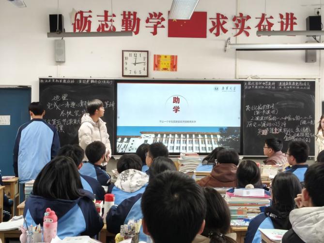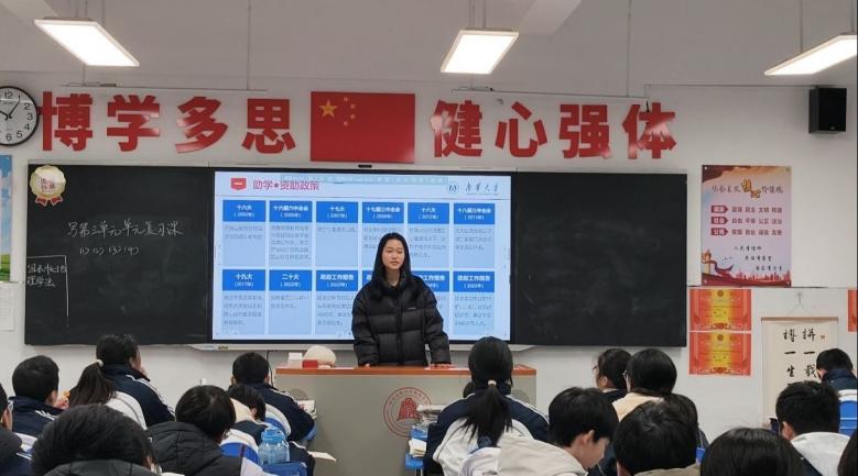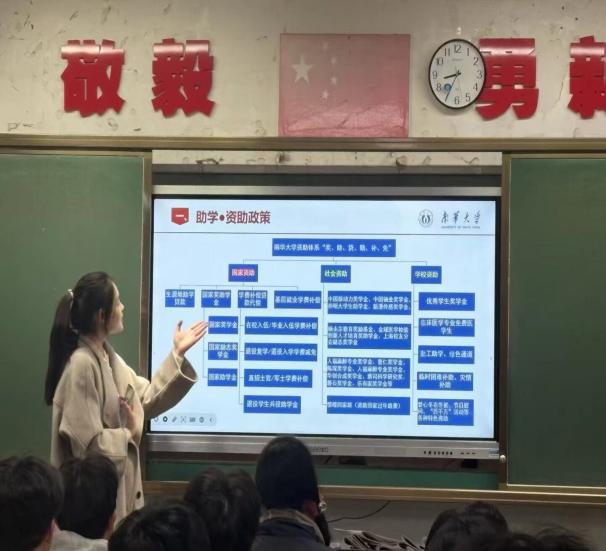 走进高中母校,为追梦学子点亮希望。宣讲团成员怀揣感恩之心回到各自的高中母校,通过集中宣讲、班级座谈、一对一咨询等形式,为母校学子送上全面的资助政策“大礼包”,成员们围绕生源地信用助学贷款、国家助学金、国家励志奖学金等重点资助项目,详细讲解 “入学前、入学时、入学后”全周期资助帮扶政策,现场解答学子们关于政策认知、学业规划、大学报考的各类疑问。同时,宣讲团成员结合自身受助成长经历,分享在南华大学的学习生活、专业发展与实践收获,传递“他助—自助—助人”的资助育人理念,消除困难学子的升学顾虑,为他们逐梦大学注入信心与力量。