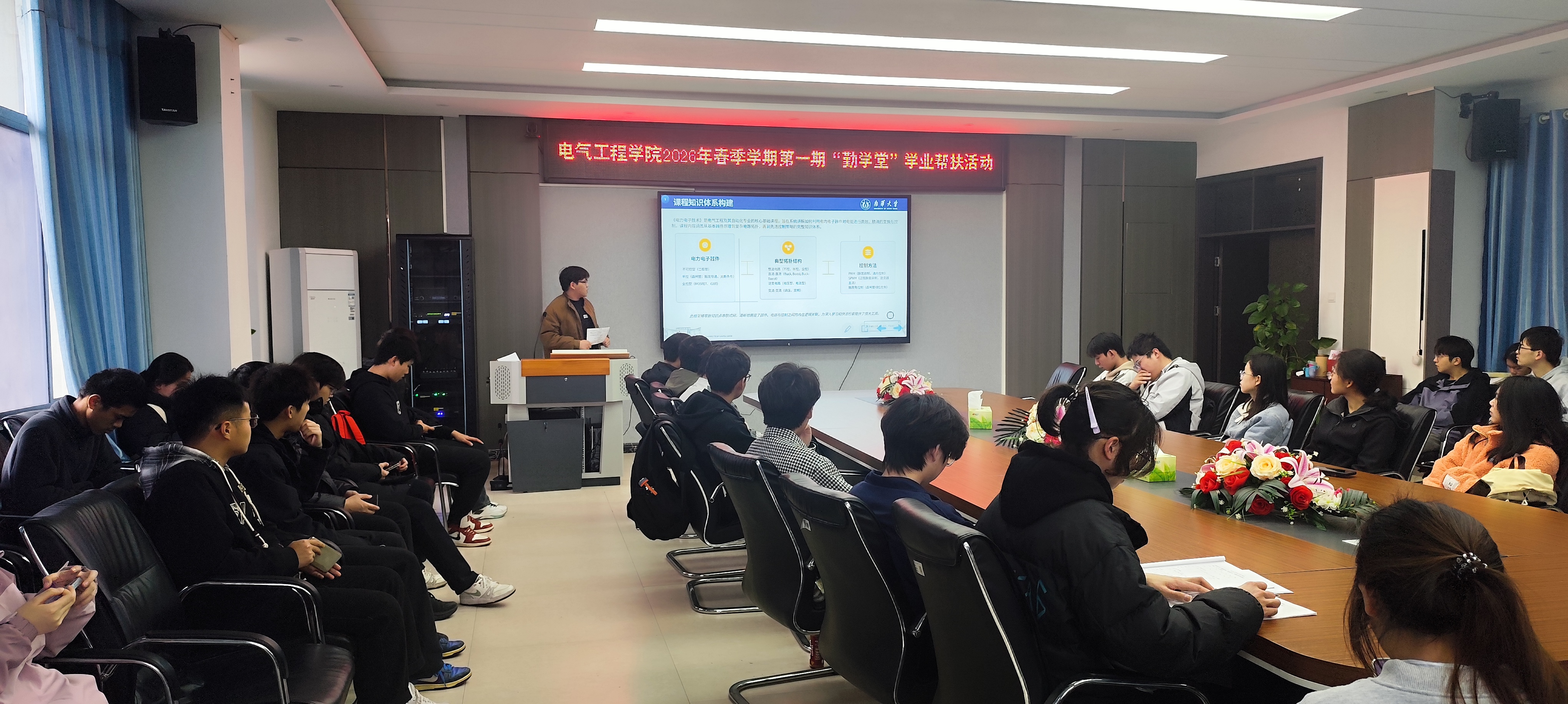 4月2日,南华大学电气工程学院在崇业楼B301会议室成功举办2026年春季学期第一期“勤学堂”学业帮扶活动,聚焦“电力电子技术”课程,由国家励志奖学金获得者詹家诚同学担任主讲。