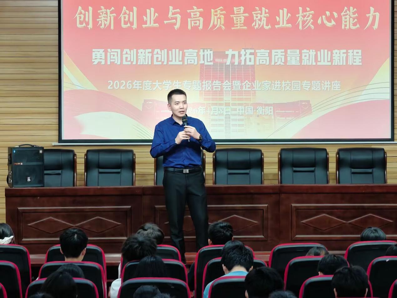 4月8日,我院在雨母校区崇业楼学术报告厅成功举办创新创业与高质量就业专题讲座。本次讲座特邀湖南省商务厅培训中心讲师吴振华老师主讲,学院2025级同学到场参加。
