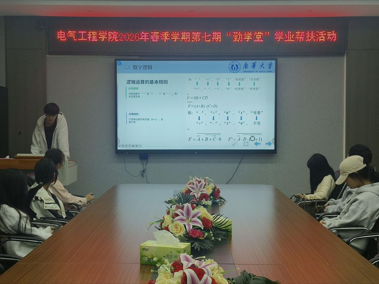 4月24日,南华大学电气工程学院于崇业楼B301室成功举办2026年春季学期第七期“勤学堂”学业帮扶活动。活动围绕“数字电子技术”专题展开,邀请国家励志奖学金获得者易大伟担任本期主讲。